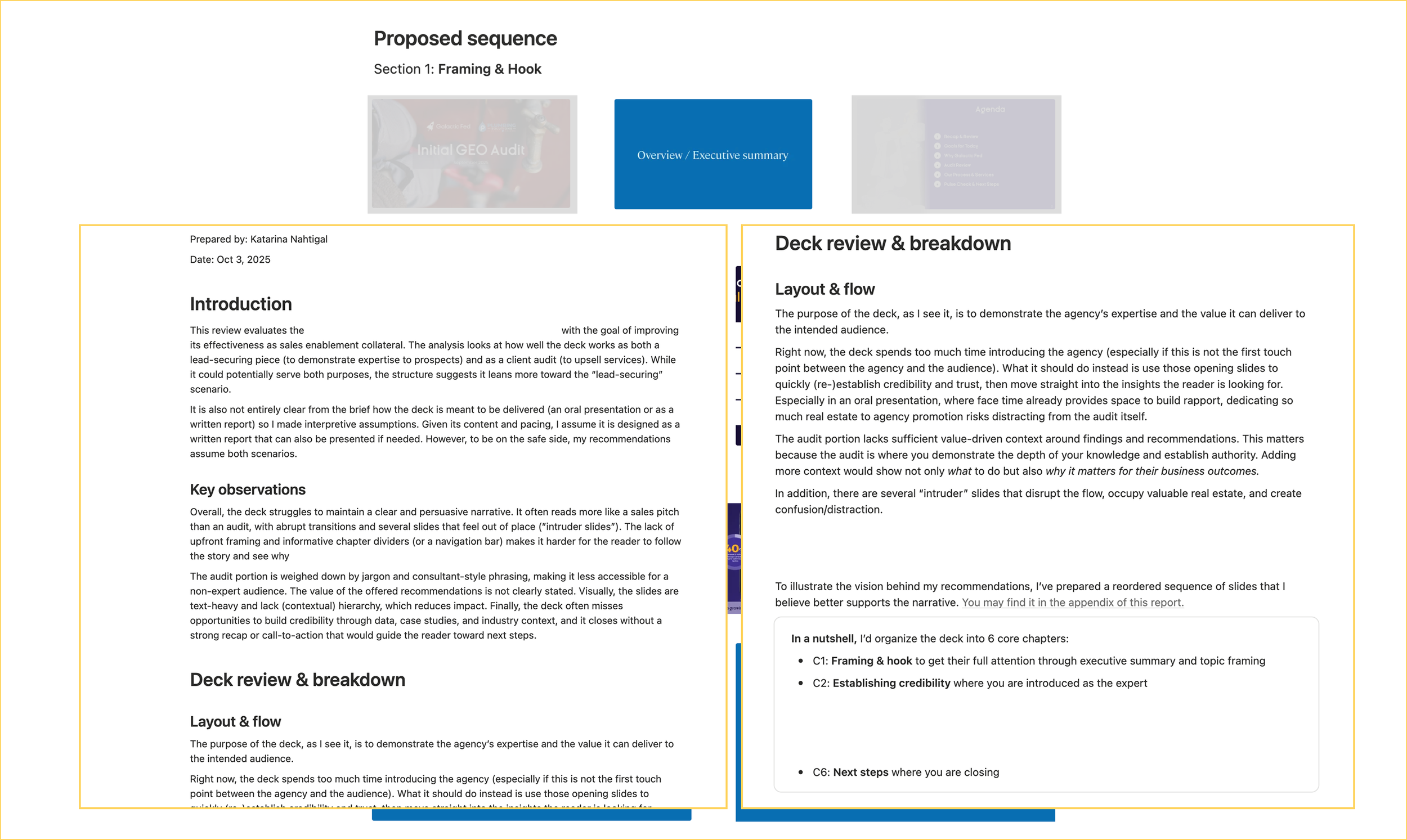 Before diving into the visual review, I build a quick messaging map — a snapshot of your current story, value proposition, and differentiators. This helps pinpoint where your existing materials might be underselling you.